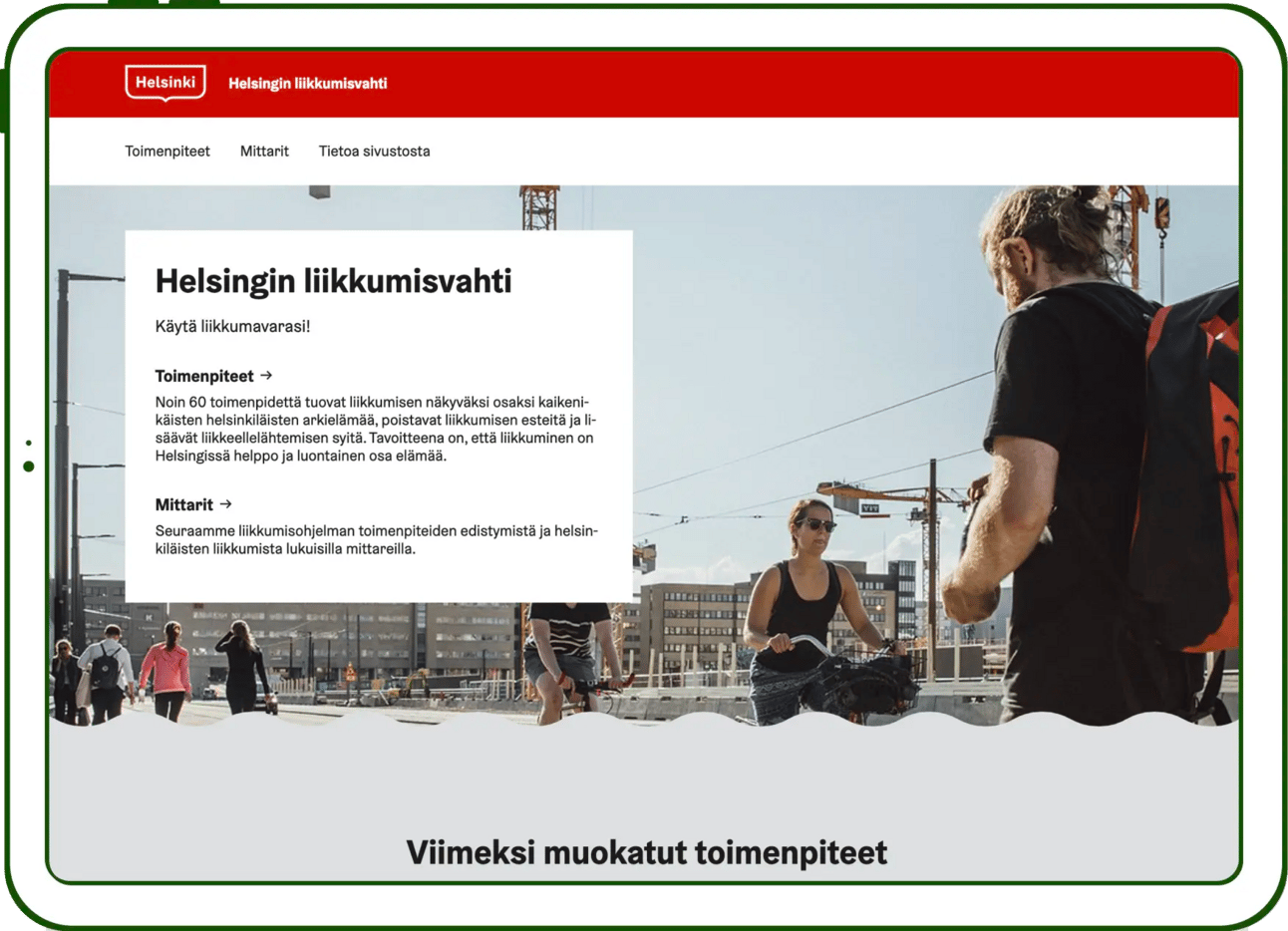 When Helsinki approached us to use our Watch platform to monitor also their mobility action plan, I got enthusiastic but had questions. Is a platform we designed for climate action plans suitable for a completely different topic? Could striving for carbon neutrality and promoting mobility have anything in common?