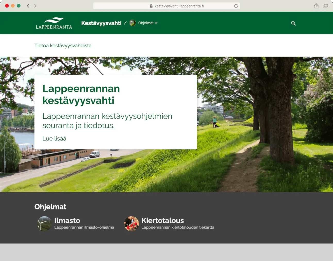 Lappeenranta’s Sustainability Watch now has a common landing page, which tells about the city’s sustainability work. You can navigate between the circular economy roadmap and the climate plan and see which actions and indicators are interconnected: for instance, actions that improve circular economy in building construction can also have positive impacts on climate mitigation.